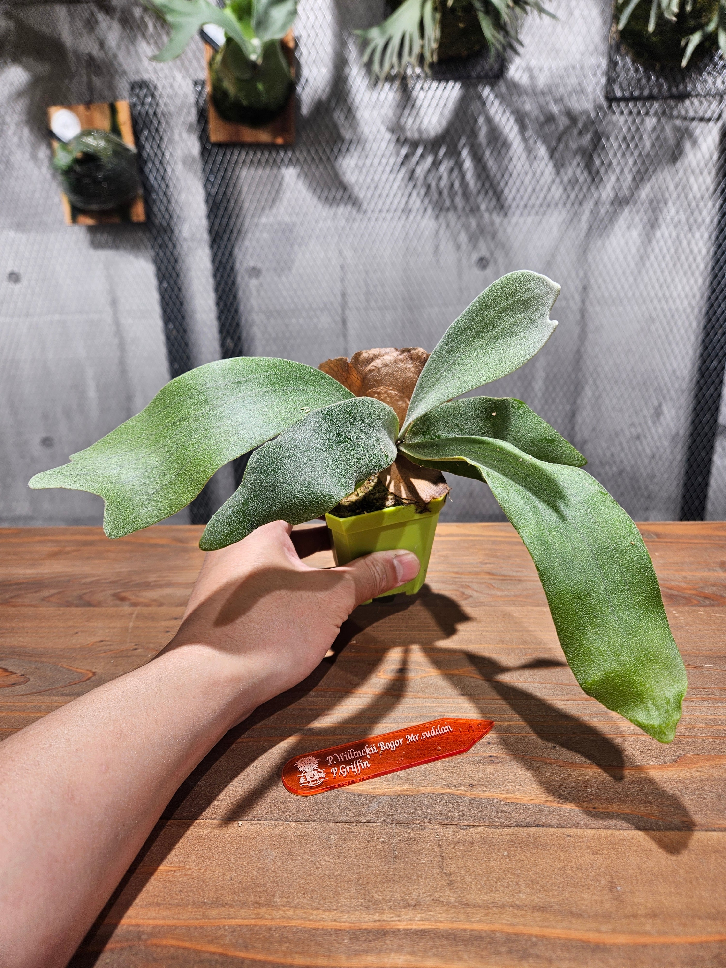 このP.willinckii Bogor Mr.suddan × P.Griffinは、魅力的な形状と優雅な美しさを兼ね備えたビカクシダです。その華やかな葉は、まるで大自然の作品のように空間を彩ります。日々成長する様子を観察することで、心に潤いをもたらし、安らぎのひとときを提供してくれます。この特別なビカクシダをお迎え入れ、緑あふれる美しい空間を作り上げてみませんか?あなたの生活に新たな息吹を与える特別な存在になることでしょう!